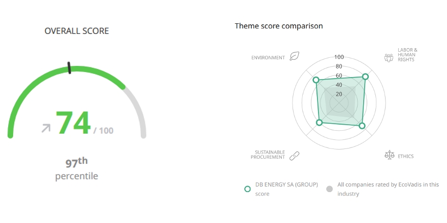 Z nieukrywaną dumą i wielką radością prezentujemy wynik tegorocznego rankingu Eco Vadis! DB Energy SA otrzymała złoty medal i znalazła się w top 5 % firm na świecie zaangażowanych ekologicznie i społecznie w politykę zrównoważonego rozwoju, osiągając wynik 74/100.