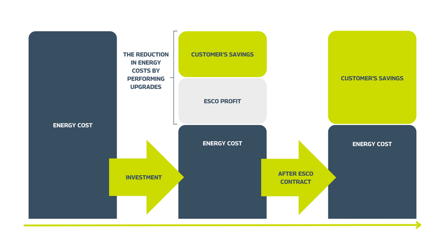 The ESCO model eliminates the need for the client to use their own financial resources for investments. The company does not have to engage its own capital while still enjoying the benefits of improved energy efficiency. Additionally, a very important aspect increasing the attractiveness of the ESCO model is the possibility of keeping such a project off the balance sheet.
